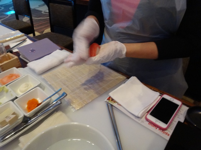 we didn’t get to use a real knife (safety issues), so the chefs would roam the room with knives and cut our rolls for us